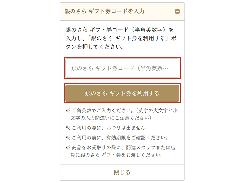 (1)銀のさらギフト券コード(半角英数字)を入力し、「銀のさらギフト券を利用する」ボタンを押してください。
