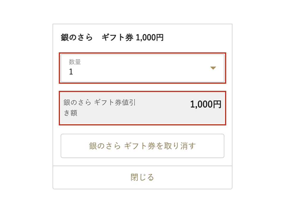(3)ご利用になる枚数だけ、数量を変更してください。ギフト券の利用合計金額が表示されますので、確認してください。